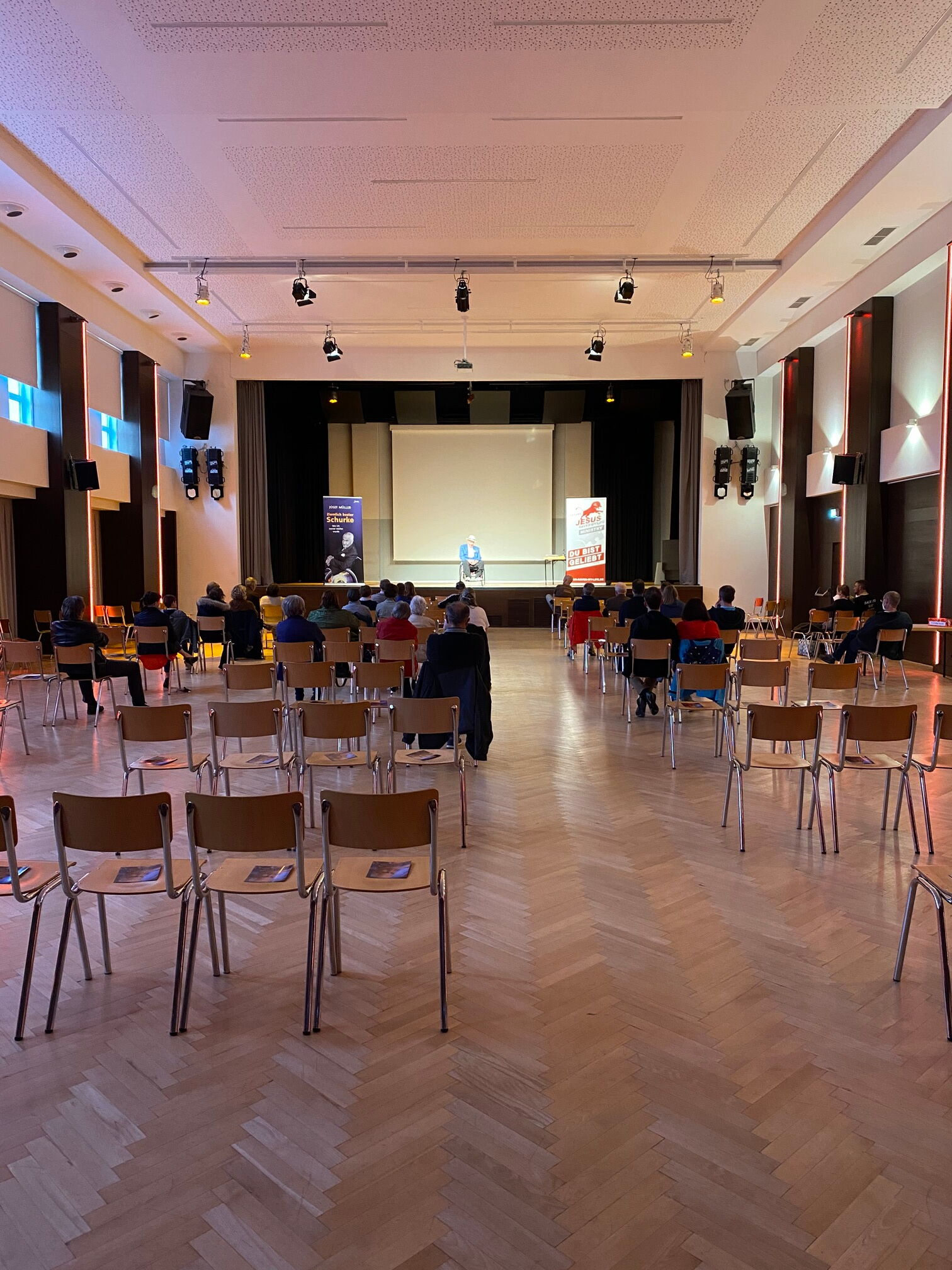 Durch die Einladung von Franz Wimberger und Max von JESUSCREW sprachen Sara und Josef am Freitagabend in der Turnhalle in Perg. Junge Menschen die offen waren für das volle Evangelium. Auch hier mussten die Abstandregeln eingehalten werden, aber die Halle war groß genug.